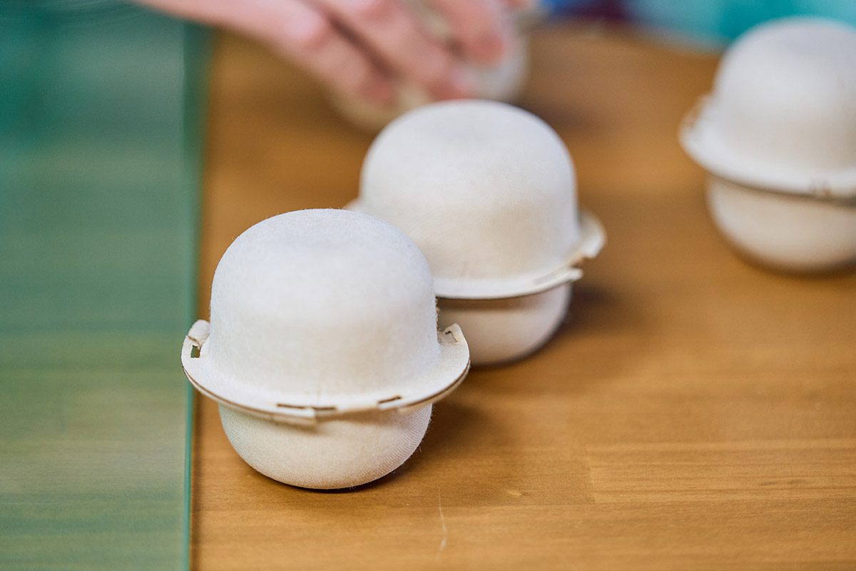 片桐: はじめに作ったのは、「ガチャガチャ」や「ガチャポン」と呼ばれるカプセル型自動販売機の、カプセル部分です。通常はプラスチックで作られるこの容器を、再生パルプに変えてデザインし、試作品を作りました。これは世界包装機構主催のワールドスター2025で「ワールドスター賞」を受賞するなど、一定の評価を得ることができました。(「ガチャガチャ」、「ガチャポン」は株式会社バンダイの登録商標です。)