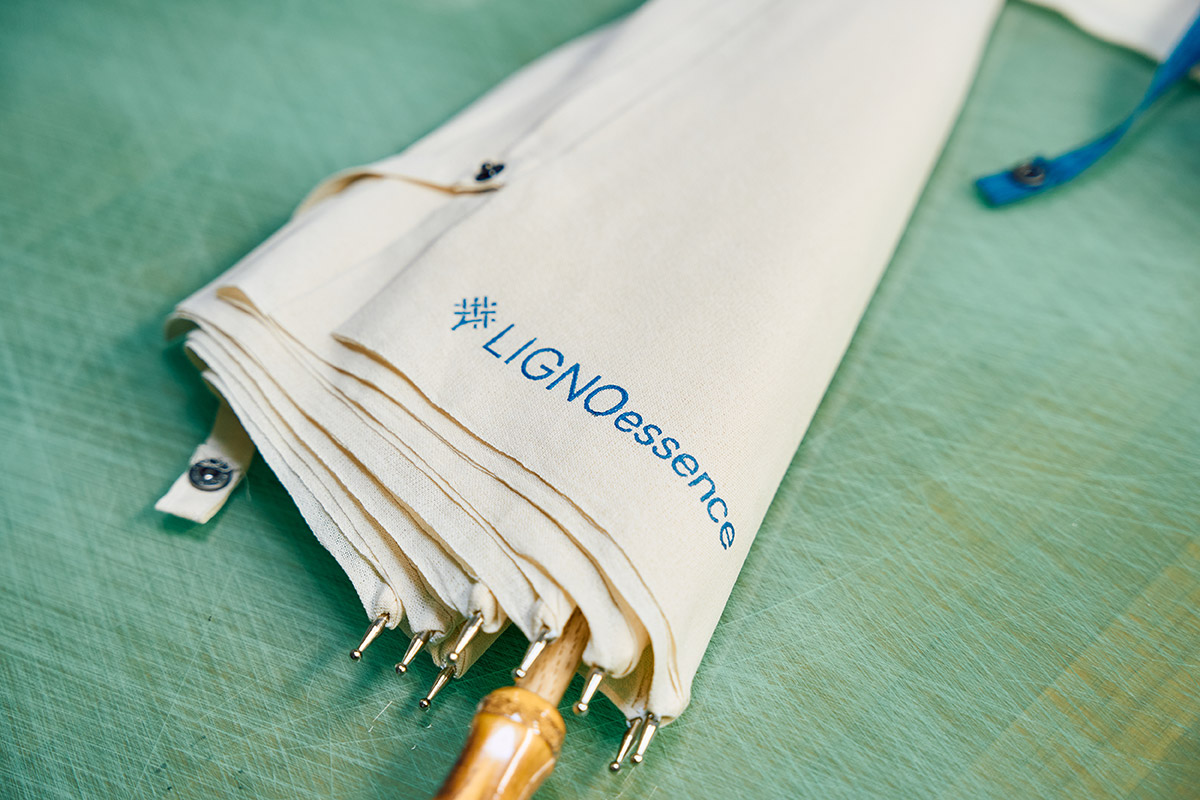 試行錯誤の末にできあがった、リグノエッセンスの日傘。木から生まれた繊維と天然染の色合いにより、やさしい風合いを感じさせる。
